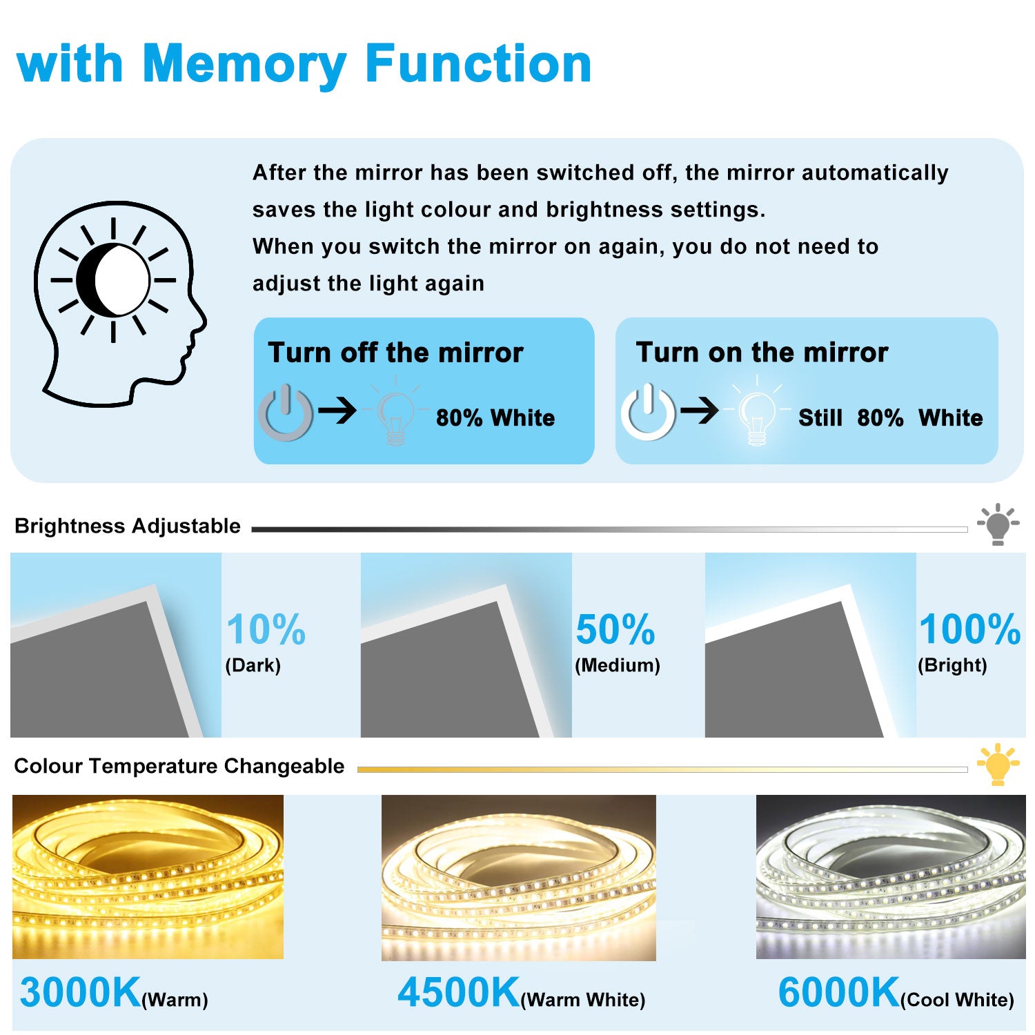 • Support Wall Switch Control, this illuminated bathroom mirror support wall switch. You can control the bathroom mirror by the wall switch. Also support touch switch control.